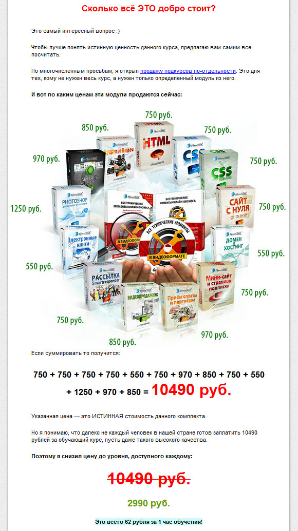 Сначала Евгений показал, как много всего полезного получит человек, если приобретет сей инфо-продукт. Затем сколько это будет стоить, если покупать все по отдельности — получилась внушительная сумма в 10490 рублей. Да, цена отпугивает. Но потом Евгений говорит, что снижает цену, доступную каждому, до уровня 2990 рублей — цена снизилась в 3,5 раза. И, наконец, контрольный выстрел — подсчет стоимость одного часа обучения. Получается совсем мизер — «это всего 62 рубля за 1 час обучения!»